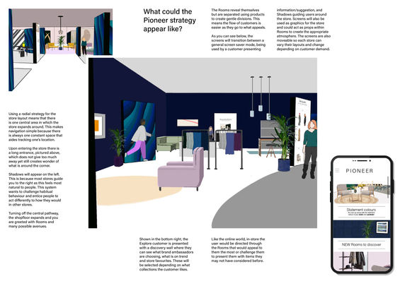 Concepts around brand, spatial theories, and wayfinding have guided this project to create the strategy, Pioneer; a unique, forward-thinking retail experience that connects the two worlds, physical and online, for seamless browsing.